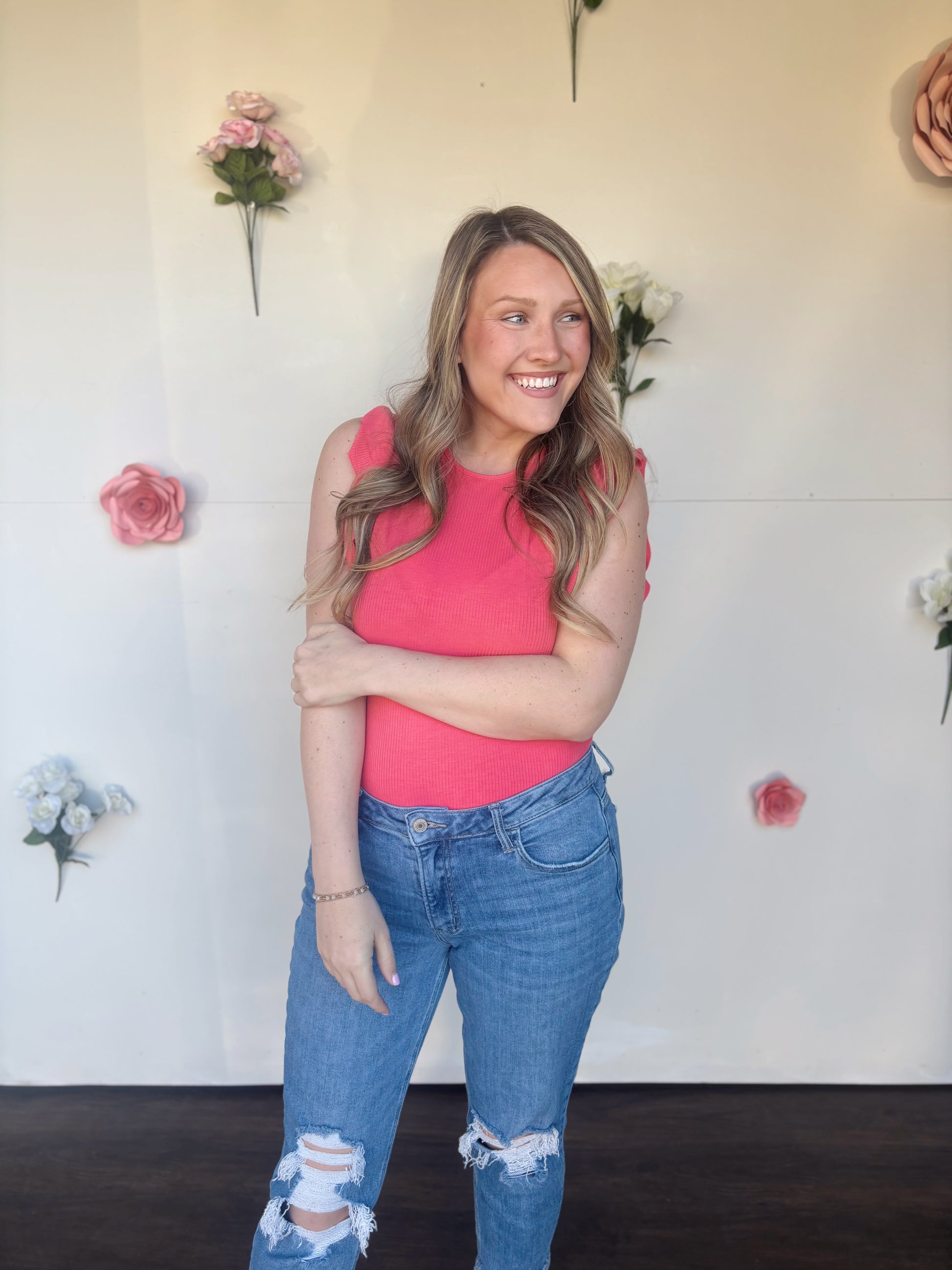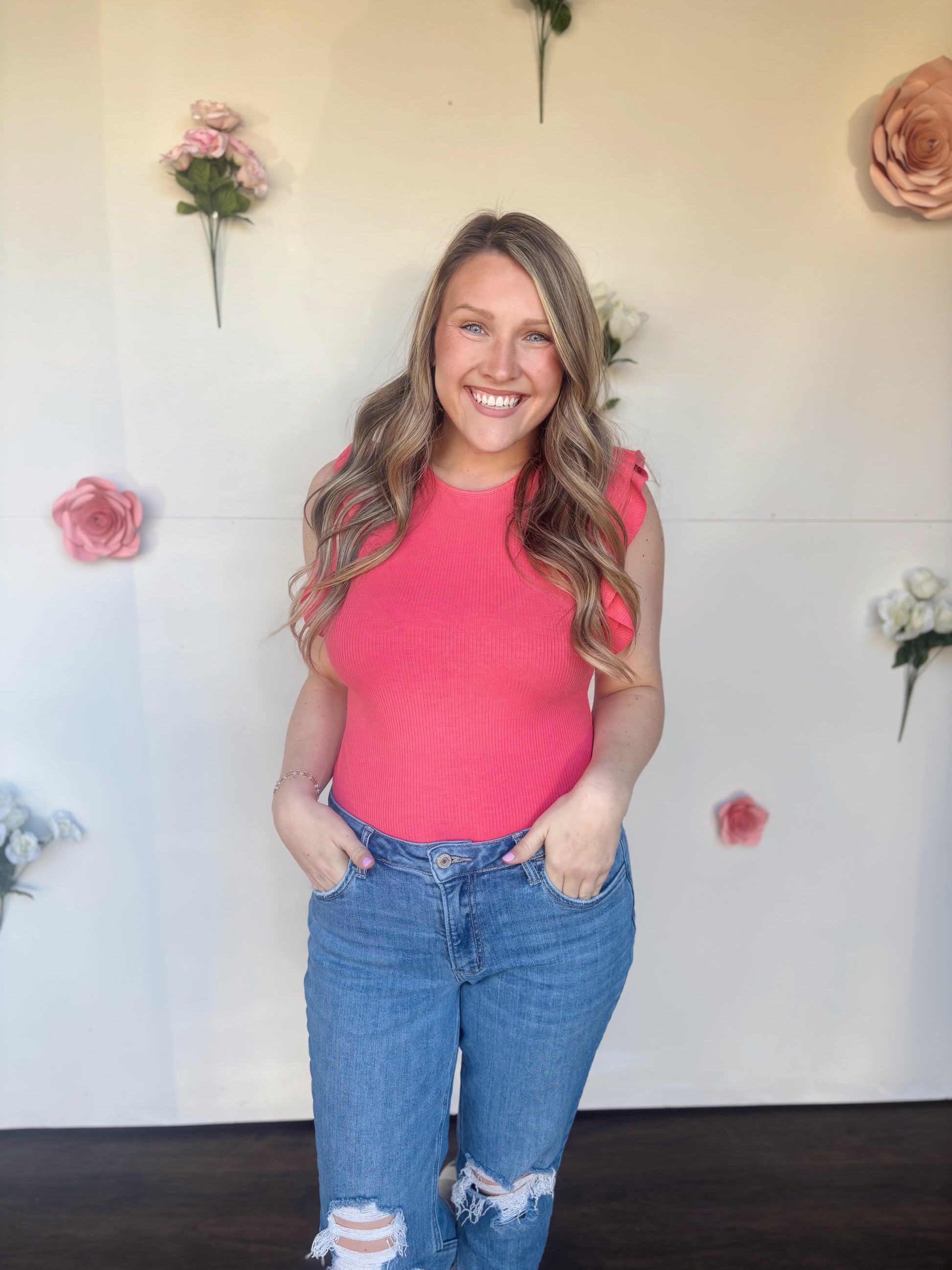 The cutest and most flattering bodysuit! The flutter sleeves give it the perfect detail while it has you feeling snatched! Full coverage bottom cut no thong crawling up cracks