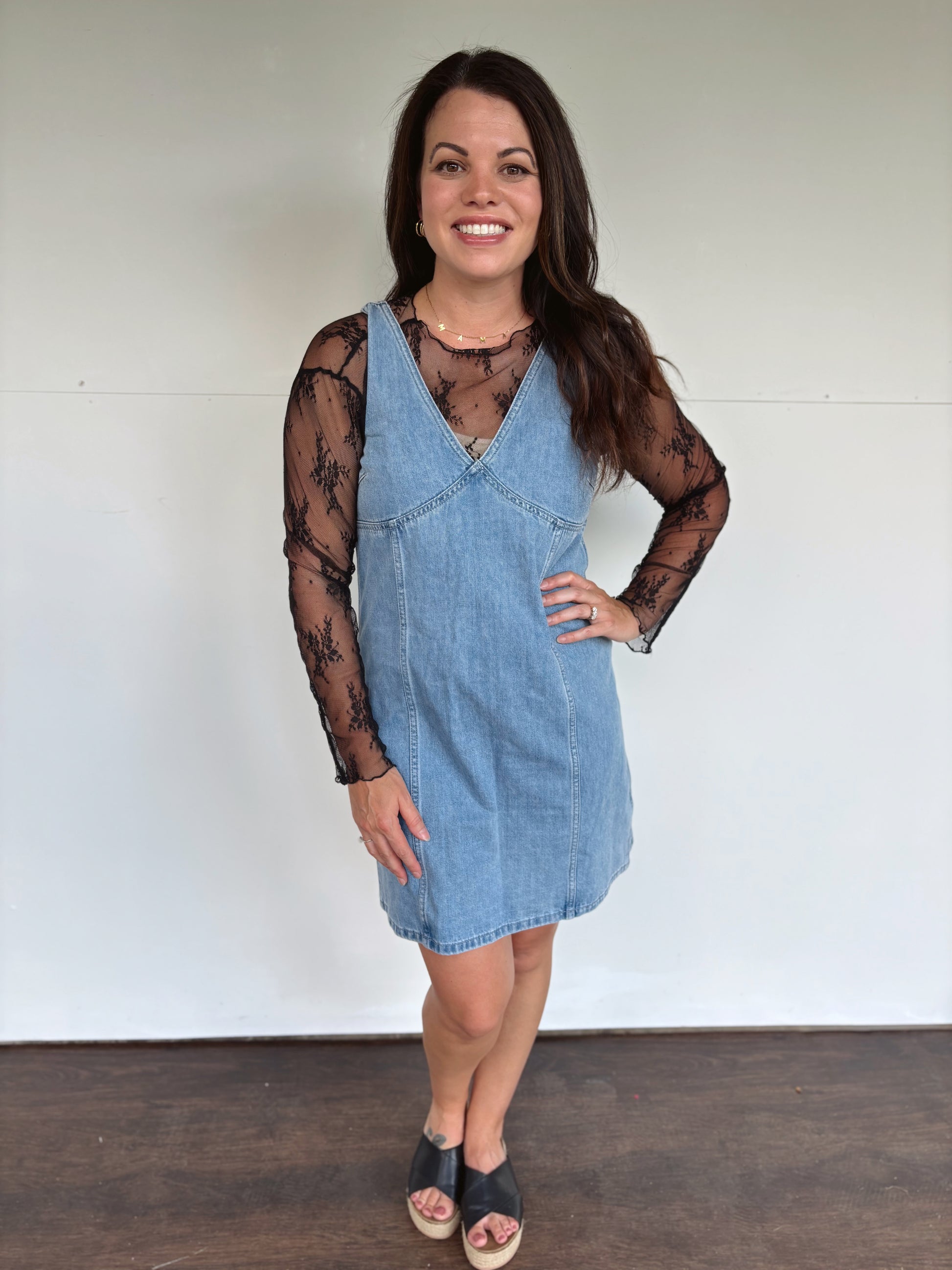 This denim dress is perfection! You can pair it so many different ways! Doesn’t have much stretch!